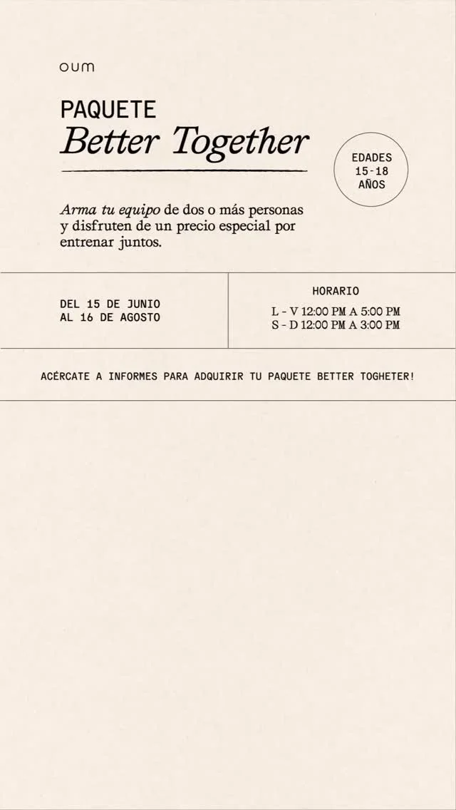 Vive tu versión del bienser cada día en OUM. Encontrarás todo lo que necesitas para alcanzar tu mejor versión: comunidad, gimnasio, clases, amenidades, spa, talleres, eventos, y más.
